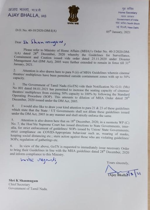 தமிழகத்தில் திரையரங்குகளில் 100% இருக்கைகளுக்கு அனுமதி அளிக்கக் கூடாது என்று மத்திய அரசு அதிரடி உத்தரவு பிறப்பித்துள்ளது. திரையரங்குகளில் 100% இருக்கைகளுக்கு தமிழக அரசு அனுமதி அளித்திருப்பது விதிமீறல் என தமிழக அரசின் தலைமைச் செயலாளருக்கு மத்திய உள்துறை அமைச்சக செயலாளர் அஜய் பல்லா கடிதம் எழுதியுள்ளார். கொரோனா தடுப்புக்கான மத்திய அரசின் வழிகாட்டு விதிகளுக்கு ஏற்ப புதிய உத்தரவை பிறப்பிக்க தமிழக அரசுக்கு அறிவுறுத்தியுள்ளார்.