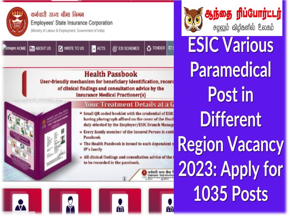 மத்திய அரசின் கீழ் இயங்கும் தொழிலாளர் அரசு காப்பீட்டு கழகத்தில் (ESIC) காலியாக உள்ள துணை மருத்துவ பணியிடங்களை நிரப்ப அறிவிப்பு வெளிவந்துள்ளது. இதில் நாடு முழுவதும் மொத்தம் 1035 பணியிடங்கள் நிரப்பப்பட உள்ளன. இதில் தமிழ்நாடு மண்டலத்தில் 56 இடங்கள் நிரப்பப்பட உள்ளன. இந்த பணியிடங்கள் நேரடி நியமனம் அடிப்படையில் நிரப்பப்பட உள்ளன. தகுதியானவர்கள் 30.10.2023 க்குள் விண்ணப்பித்துக் கொள்ளலாம்.