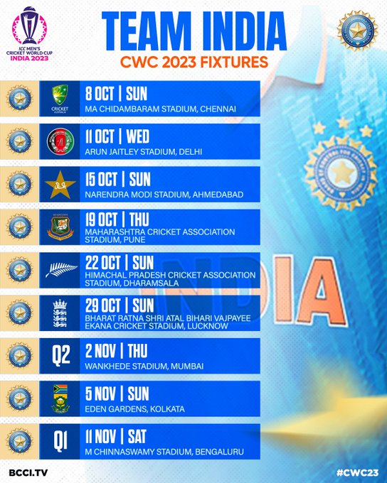தற்போது, 2023ஆம் ஆண்டு ஒருநாள் உலகக் கோப்பை தொடரை இந்திய அணி நடத்துவதால், இந்தியாதான் கோப்பை வெல்லும் என்ற நம்பிக்கையில் ரசிகர்கள் இருக்கிறார்கள்.இந்நிலையில்தான், இந்த 2023 உலகக் கோப்பை தொடருக்கான இந்திய அணியின் அட்டவணை தற்போது வெளியாகியுள்ளது