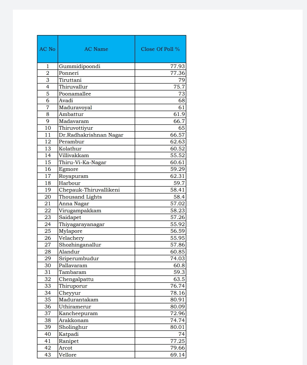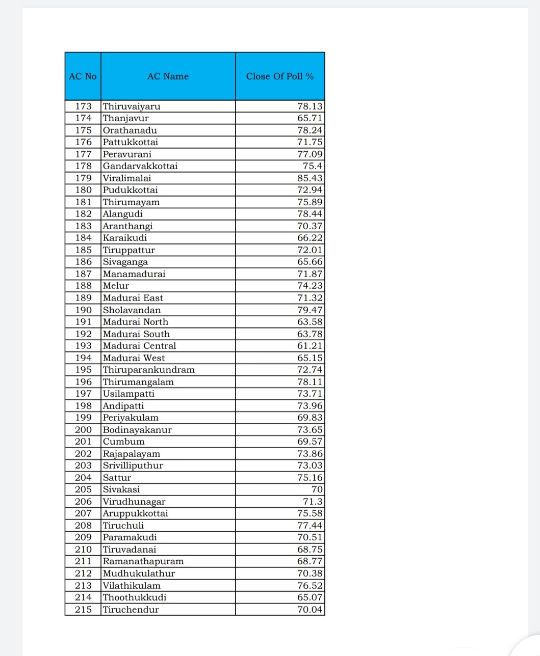 தமிழ்நாடு சட்டசபைத் தேர்தல் வாக்குப்பதிவு நேற்று ஒரே கட்டமாக நடந்து முடிந்த நிலையில் வாக்குப்பதிவு வீதம் குறித்து தமிழக தேர்தல் அதிகாரி சத்ய பிரதா சாகு விவரங்களை வெளியிட்டுள்ளார். அந்த வகையில் தமிழ்நாடு மொத்த வாக்குப்பதிவு 72.78% என்றும் அதிக வாக்குப்பதிவு தருமபுரி மாவட்டம் பாலக்கோட்டில் 87.33%.ஆகவும் குறைவான வாக்குப் பதிவான தொகுதிகள் சென்னை வில்லிவாக்கம் – 55.52% தொகுதி என்றும் தெரிய வந்துள்ளது.