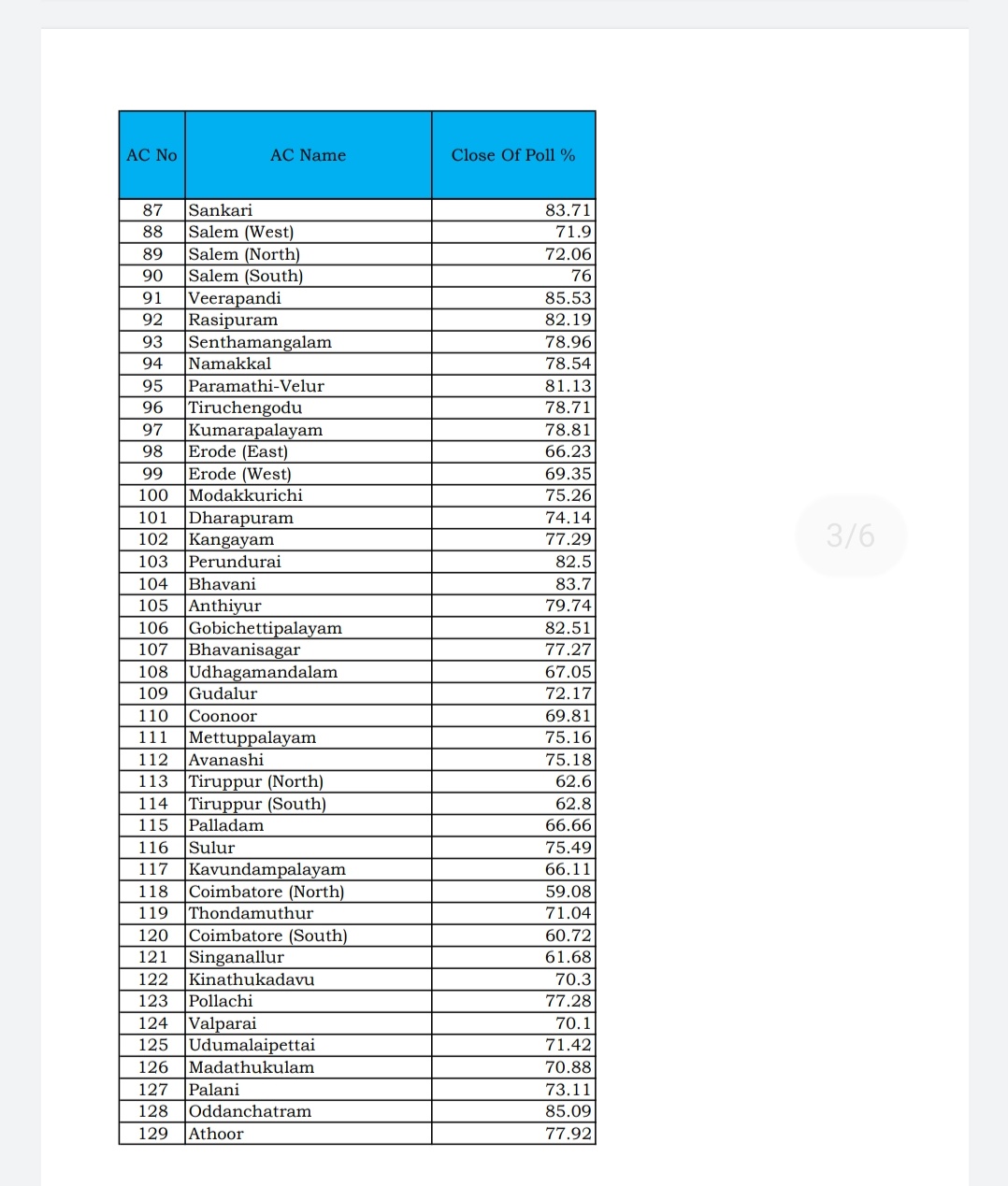இந்நிலையில் இந்நிலையில் முதல்வர் வேட்பாளர்கள் போட்டியிடும் தொகுதிகளான எடப்பாடி – 85.60% சதவீதமும், மு க ஸ்டாலின் போட்டியிடும் கொளத்தூர் – 60.52% சதவீதமும் , டிடிவி தினகரன் களமிறங்கிய கோவில்பட்டியில் – 67.43 % மற்றும் கோவை தெற்கு – 60.72 % சதவீதம் என்று தெரிய வந்துள்ளது