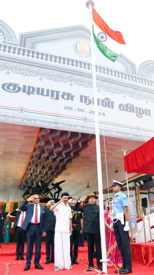 இந்தியாவின் 75வது குடியரசு தினவிழா இன்று நாடு முழுவதும் கொண்டாடப்பட்டு வருகிறது. அதன் ஒரு பகுதியாக சென்னையில் உழைப்பாளர் சிலை அருகில் குடியரசு தினவிழா நடைபெற்றது. இந்நிகழ்வில் முதலமைச்சர் மு.க.ஸ்டாலின் முன்னிலையில் தமிழ்நாட்டு கவர்னர் ஆர்.என்.ரவி தேசியக் கொடியை ஏற்றி மரியாதை செய்தார். தொடர்ந்து, ராணுவம், கடற்படை, விமானப்படை, கடலோர காவல் படை, தமிழக காவல் துறையின் பல்வேறு பிரிவுகள், தேசிய மாணவர் படை, வனம், சிறை, தீயணைப்பு துறைகளின் படைப்பிரிவினர், பள்ளி, கல்லூரி பேண்டு வாத்திய குழுவினர், சாரண, சாரணியர், ஊர்க்காவல் படையினரின் அணிவகுப்பு மரியாதையை கவர்னர் ஏற்றுக் கொள்ளும் நிகழ்வு நடைபெற்றது.