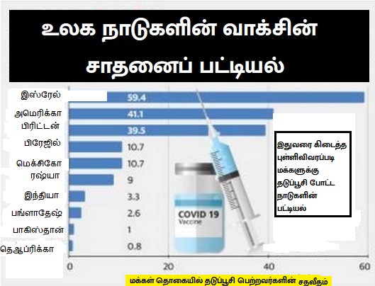 முதல் இடத்தில் உள்ள இஸ்ரேல் தன்னுடைய மக்கள் தொகையில் 59.4% பேருக்கு தடுப்பூசி செலுத்தியுள்ளது.