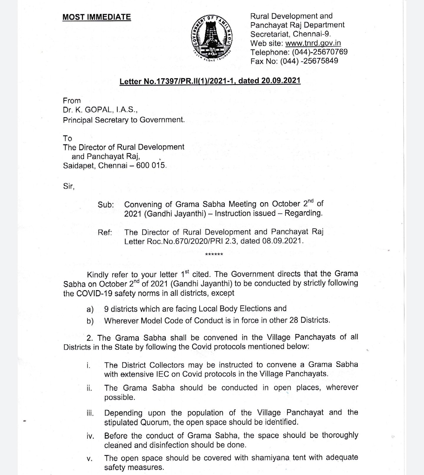அக்டோபர் 2, 2021 காந்தி ஜெயந்தி அன்று கிராம சபைக் கூட்டங்கள் நடத்த அனுமதி!