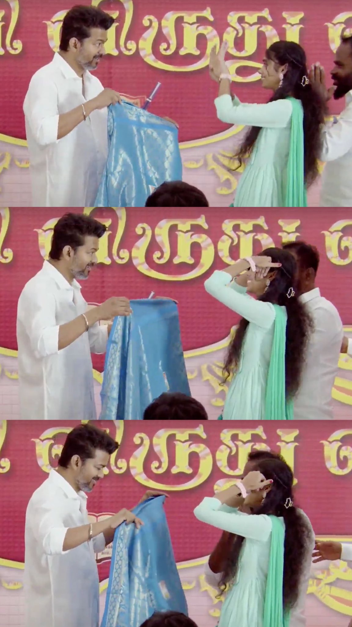மேடையில் மாணவர்களும் பெற்றோர்களும் விஜயுடன் ஃபோட்டோ எடுக்கும் போது ஹார்ட்டின் போஸ், ’மாஸ்டர்’ பட போஸ் என புகைப்படங்கள் எடுத்திருப்பது பேசுபொருளாகி இருக்கிறது. மாணவர்கள் கேட்டதற்காக முகம் சுழிக்காமல் புன்னகையுடன் போஸ் கொடுத்து மகிழ்ந்தார் விஜய்.இன்னொரு பக்கம் மேடையில் மாணவரின் பெற்றோர் ஒருவர் விஜயின் ‘வாங்கண்ணா…வணக்கங்கணா’ பாடலை கொஞ்சம் வரிகள் மாற்றி ‘உங்களை முதலமைச்சர் ஆக்குவோங்கண்ணா’ எனப் பாடி வைரலாகி இருக்கிறார்.
