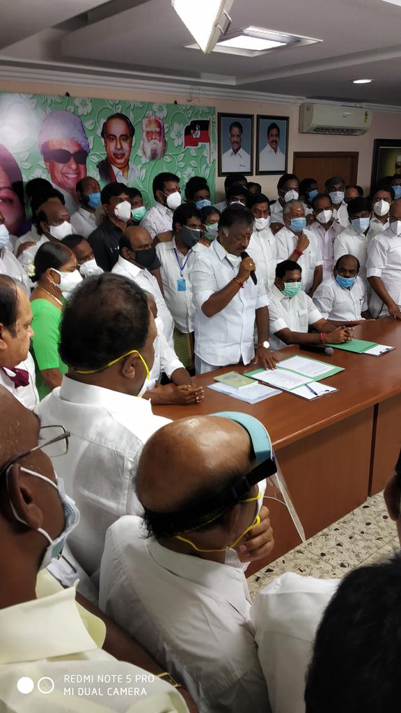 இதனையடுத்து, ஓ.பன்னீர்செல்வம் அவர்கள், எடப்பாடி பழனிசாமி அவர்களுக்கு பொன்னாடை போர்த்தி பூங்கொத்து வழங்கியுள்ளார். முன்னதாக ஓபிஎஸ் அவர்களின் கோரிக்கையின் படி, எடப்பாடி பழனிசாமி அவர்கள், அதிமுகவுக்கு 11 பேர் கொண்ட வழிகாட்டுதல் குழு பற்றிய அறிவிப்புகளை வெளியிட்டுள்ளார்.அதன்படி 1. அமைச்சர் திண்டுக்கல் சீனிவாசன்