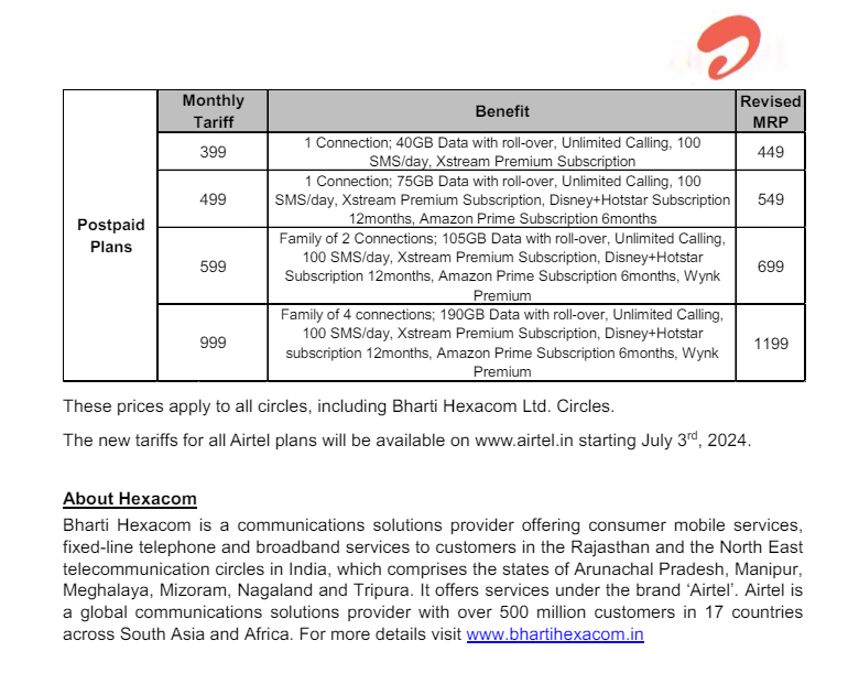 மேலும் “ஏர்டெல் தனது மொபைல் கட்டணங்களை 2024 ஜூலை 3 முதல் மாற்றி அமைக்க உள்ளது. பட்ஜெட் சவாலான நுகர்வோர் மீதான எந்தச் சுமையையும் நீக்கும் வகையில், நுழைவு நிலை திட்டங்களில் மிகக் குறைந்த விலை உயர்வு (ஒரு நாளைக்கு 70 பைசாவுக்கும் குறைவாக) இருப்பதை உறுதி செய்துள்ளோம்.” என பார்தி ஏர்டெல் ஒழுங்குமுறை ஆணையத்தில் தாக்கல் செய்த அறிக்கையில் கூறியுள்ளது. அத்துடன் புதிய கட்டணங்களாக, அன்லிமிடெட் வாய்ஸ் திட்டங்களில், ரூ.179 ரீசார்ஜ் திட்டம் ரூ.199 ஆகவும், ரூ.455 திட்டம், ரூ.599 ஆகவும், ரூ.1,799 திட்டம் ரூ.1,999 ஆகவும் உயர்த்தப்பட்டுள்ளதாக அந்த அறிவிப்பில் ஏர்டெல் தெரிவித்துள்ளது.