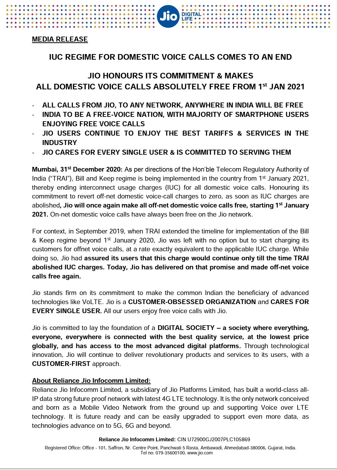 அத்துடன் ஜியோ மீண்டும் 2021 ஜனவரி 1 முதல் அனைத்து ஜியோவிலிருந்து பிற நெட்வொர்க்களுக்கான உள்நாட்டு குரல் அழைப்புகளையும் இலவசமாக வழங்கும். மற்றபடி ஆன்-நெட் உள்நாட்டு குரல் அழைப்புகள் ஜியோ நெட்வொர்க்கில் எப்போதும் இலவசமாக இருக்கும்’ என்று ரிலையன்ஸ் ஜியோ தனது அறிக்கையில் கூறியிருக்கிறது.
