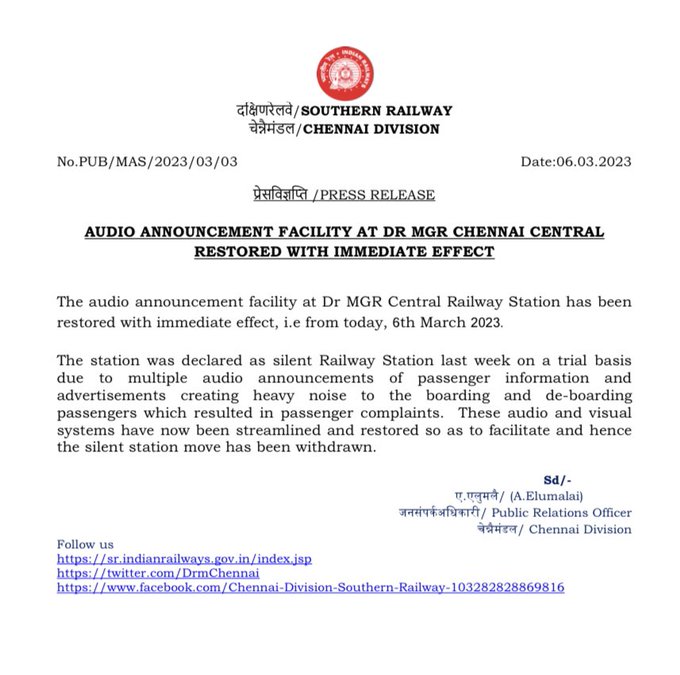 சென்னை சென்ட்ரல் ரயில் நிலையத்தில் அறிவிப்புகள் வழக்கம்போல் ஒலிபெருக்கிகள் மூலம் அறிவிக்கப்படும்!