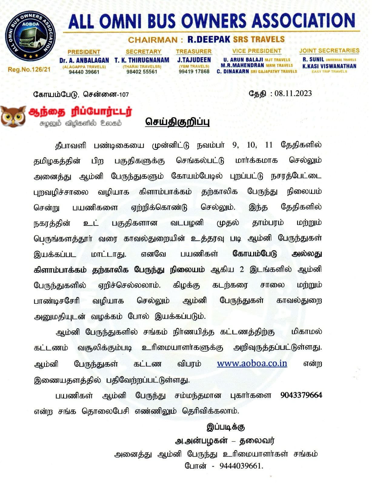இது குறித்து ஆம்னி பேருந்து உரிமையாளர்கள் சங்கம் வெளியிட்டுள்ள செய்திக்குறிப்பில், ‘’தீபாவளி பண்டிகையை முன்னிட்டு நவம்பர் 9, 10, 11 தேதிகளில் தமிழகத்தின் பிற பகுதிகளுக்கு செங்கல்பட்டு மார்க்கமாக செல்லும் அனைத்து ஆம்னி பேருந்துகளும் கோயம்பேட்டில் புறப்பட்டு நசரத்பேட்டை புறவழிச்சாலை வழியாக கிளாம்பாக்கம் தற்காலிக பேருந்து நிலையம் சென்று நகரத்தின் பயணிகளை ஏற்றிக்கொண்டு செல்லும்.