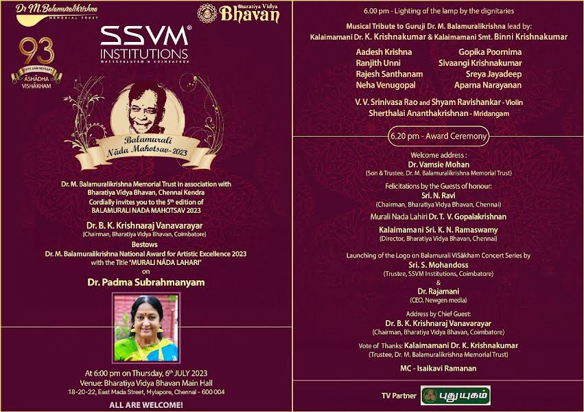 Dr.M.பாலமுரளிகிருஷ்ணா அவர்களின் 93-வது நட்சத்திர பிறந்த ஆஷாட விசாகம் நாளை முன்னிட்டு Dr.M.பாலமுரளிகிருஷ்ணா நினைவு அறக்கட்டளையின் கலையில் சிறந்தவருக்கான தேசிய விருது அறிவிக்கப்பட்டுள்ளது. 2023-கான முரளீ நாத லஹரி விருது மற்றும் ஒரு லட்ச ரூபாய் பரிசினை பரதநாட்டிய கலைஞர் Dr.பத்மா சுப்பிரமணியம் அவர்களுக்கு வழங்குவதில் பெருமை கொள்கிறது. இந்த விருது நிகழ்ச்சியினை Dr.M.பாலமுரளி கிருஷ்ணா நினைவு அறக்கட்டளையுடன் சென்னை பாரதீய வித்யா பவன் இணைந்து வருகின்ற ஜூலை 6-ந்தேதி மாலை 6 மணிக்கு மைலாப்பூர் பாரதீய வித்ய பவன் பிரதான அரங்கில் நடத்துகின்றன. இந்நிகழ்ச்சி கலைமாமணி Dr.K.கிருஷ்ணகுமார் மற்றும் கலைமாமணி பின்னி கிருஷ்ணகுமார் அவர்களின் குழுவுடன் வழங்கும் இசை அஞ்சலியுடன் துவங்கவிருக்கிறது.