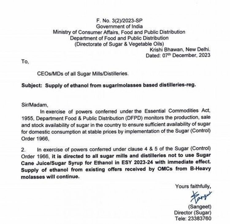 இந்த தடையை விதித்து நுகர்வோர் விவகார அமைச்சகம் உத்தரவு பிறப்பித்துள்ளது. இந்த உத்தரவு சர்க்கரை நிறுவனங்களுக்கு பின்னடைவை ஏற்படுத்தியுள்ளது. கச்சா எண்ணெய் இறக்குமதியைக் குறைக்கும் நோக்கத்தில் மத்திய அரசின் முன்முயற்சியின் ஒரு பகுதியாக எரிபொருளுடன் கலப்பதற்கு போதுமான எத்தனால் இருப்புக்கள் கிடைப்பது குறித்து இந்த நடவடிக்கை கவலை அளிக்கிறது.