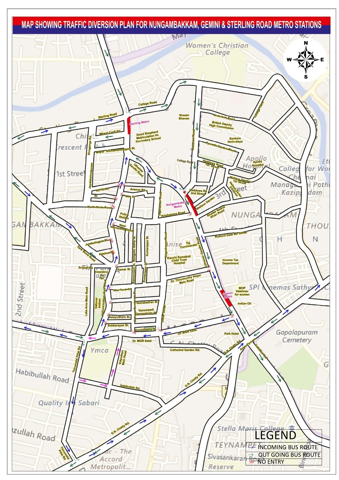 கீழ்கண்ட மெட்ரோ ரயில் நிலையங்களில் கட்டுமான பணிக்காக அண்ணா மேம்பாலம் மெட்ரோ ரயில் நிலையம், நுங்கம்பாக்கம் மெட்ரோ ரயில் நிலையம் மற்றும் ஸ்டெர்லிங் சாலை மெட்ரோ ரயில் நிலையம் ஆகிய இடங்களில் பிப்.11 முதல் ஒரு வார காலத்துக்கு பின்வரும் போக்குவரத்து மாற்றங்களை செயல்படுத்த திட்டமிடப்பட்டுள்ளது.