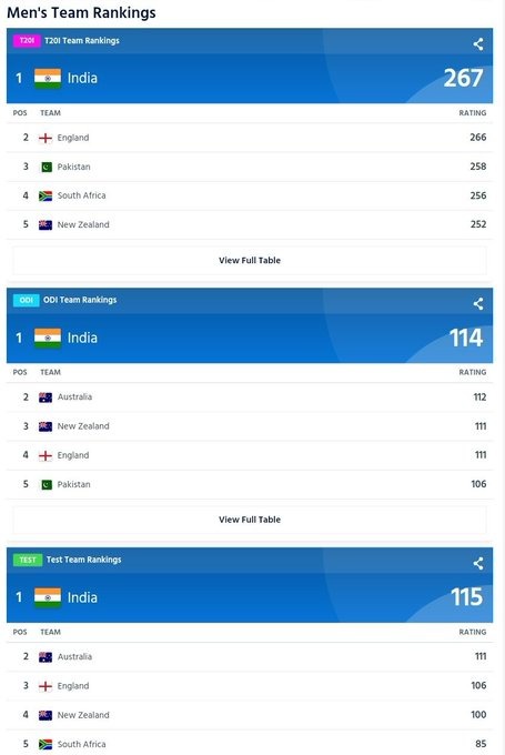 அதாவது சர்வதேச கிரிக்கெட் கவுன்சிலின் தரவரிசையில் இந்திய கிரிக்கெட் அணி டெஸ்ட், ஒருநாள் மற்றும் டி20 என அனைத்து ஃபார்மெட்டிலும் முதலிடம் பிடித்துள்ளது. முதல் முறையாக இந்திய அணி இந்த சாதனையை படைத்துள்ளது. இதற்கு முன்னர் கடந்த 2014-ல் தென் ஆப்பிரிக்க அணி மட்டும் சர்வதேச கிரிக்கெட்டில் அனைத்து ஃபார்மெட்டிலும் ஐசிசி தரவரிசையில் முதலிடம் பிடித்திருந்தது.