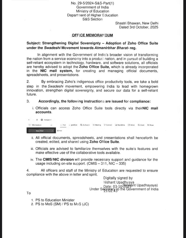 மத்திய அரசின் ‘ஆத்மநிர்பர் பாரத்’ (சுயசார்பு இந்தியா) திட்டத்தின் கீழ் டிஜிட்டல் இறையாண்மையை வலுப்படுத்தும் நோக்கில், ஒரு வரலாற்றுச் சிறப்புமிக்க முடிவை மத்திய கல்வி அமைச்சகம் எடுத்துள்ளது. இனி, கல்வி அமைச்சகத்தின் கீழ் உள்ள அனைத்து அதிகாரிகளும் அலுவல் ரீதியான அனைத்துப் பணிகளுக்கும் இந்தியாவிலேயே உருவாக்கப்பட்ட ‘ஸோஹோ அலுவலகத் தொகுப்பை’ (Zoho Office Suite) கட்டாயம் பயன்படுத்த வேண்டும் என உத்தரவிடப்பட்டுள்ளது.
