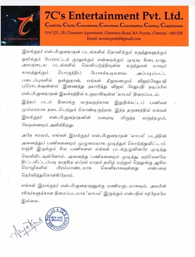 இதுகுறித்து அவர் வெளியிட்டிருக்கும் அறிக்கையில் “இயக்குநர் எஸ்.பி.ஜனநாதனின் படங்களில் தொனிக்கும் கருத்துகளுக்கும், ஒலிக்கும் போராட்டக் குரலுக்கும் என்றைக்கும் முடிவு கிடையாது. அவருடைய படங்களில் வெளிப்படுத்தியுள்ள கருத்துகள் யாவும் காலத்துக்கும் பொருந்திப் போகக்கூடியவை. அப்படிப்பட்ட படைப்புகளில் ஒன்றுதான் எங்கள் நிறுவனமும் விஜய் சேதுபதி புரொடக்ஷன்ஸூம் இணைந்து தயாரித்து விஜய் சேதுபதி நடிப்பில் எஸ்.பி.ஜனநாதன் இயக்கத்தில் உருவாகியுள்ள ‘லாபம்’ திரைப்படம்.இந்தப் படம் திரைக்கு வருவதற்கான இறுதிக்கப்பட்ட பணிகள் மும்முரமாக நடைபெற்றுக் கொண்டிருந்தன. இந்தத் தருணத்தில் எங்கள் இயக்குநர் எஸ்.பி.ஜனநாதனின் மறைவு மிகுந்த வருத்தமும், வேதனையும் அளிக்கிறது.
