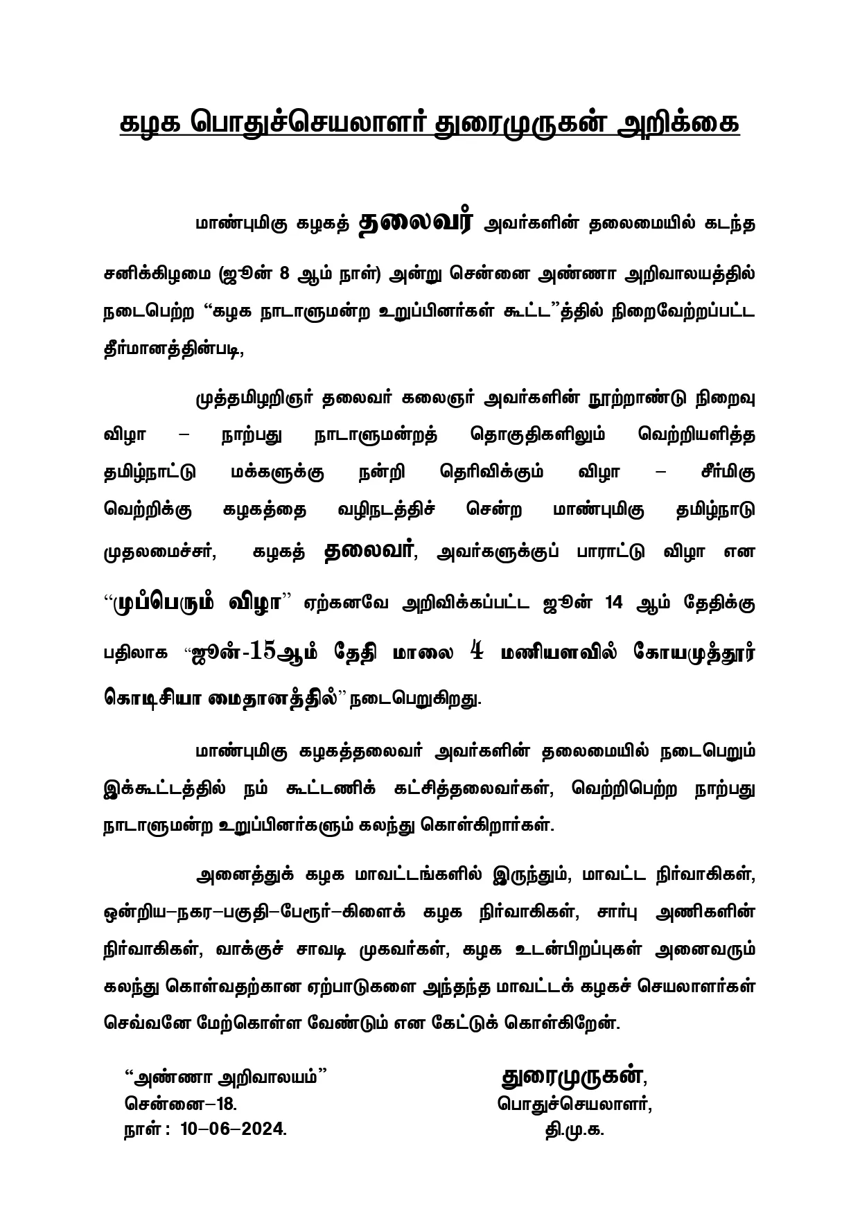 இது குறித்து திமுக பொதுச் செயலாளர் துரைமுருகன் வெளியிட்டுள்ள அறிக்கையில்; முதல்வர் மு.க.ஸ்டாலின் தலைமையில் கடந்த சனிக்கிழமை (ஜூன் 8ம் நாள்) அன்று சென்னை அண்ணா அறிவாலயத்தில் நடைபெற்ற “கழக நாடாளுமன்ற உறுப்பினர்கள் கூட்ட” த்தில் நிறைவேற்றப்பட்ட தீர்மானத்தின்படி, கலைஞர் நூற்றாண்டு நிறைவு விழா, நாற்பது நாடாளுமன்றத் தொகுதிகளிலும் வெற்றியளித்த தமிழ்நாட்டு மக்களுக்கு நன்றி தெரிவிக்கும் விழா, சீர்மிகு வெற்றிக்கு கழகத்தை வழிநடத்திச் சென்ற முதலமைச்சர், கழகத் தலைவர், அவர்களுக்குப் பாராட்டு விழா என “முப்பெரும் விழா” ஏற்கனவே அறிவிக்கப்பட்ட ஜூன் 14ம் தேதிக்கு பதிலாக “ஜூன்-15ம் தேதி மாலை 4 மணியளவில் கோயமுத்தூர் கொடிசியா மைதானத்தில்” நடைபெறுகிறது.