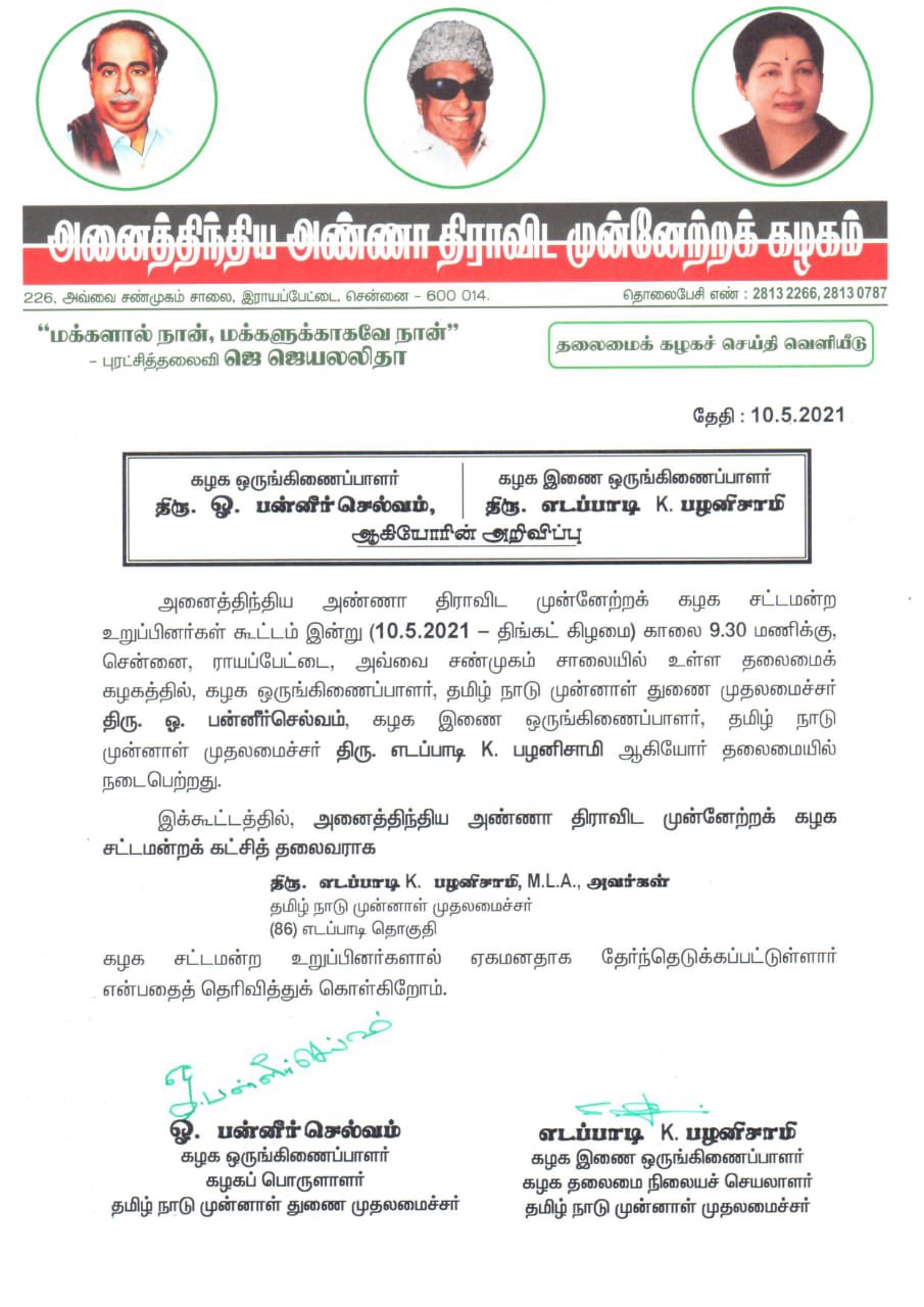 அண்ணா தி.மு.க. சட்டமன்ற உறுப்பினர்கள்‌ கூட்டம்‌ இன்று (10–ந்தேதி) திங்கட்‌கிழமை) காலை 9.30 மணிக்கு, சென்னை, ராயப்பேட்டை, அவ்வை சண்முகம்‌ சாலையில்‌ உள்ள தலைமைக்‌ கழகத்தில்‌, கழக ஒருங்கிணைப்பாளர்‌, முன்னாள்‌ துணை முதலமைச்சர்‌ ஓ. பன்னீர்செல்வம்‌, கழக இணை ஒருங்கிணைப்பாளர்‌, முன்னாள்‌ முதலமைச்சர்‌ எடப்பாடி பழனிசாமி ஆகியோர்‌ தலைமையில்‌ நடைபெற்றது. இக்கூட்டத்தில்‌, அண்ணா தி.மு.க. சட்டமன்றக்‌ கட்சித்‌ தலைவராக முன்னாள்‌ முதலமைச்சர்‌ எடப்பாடி பழனிசாமி கழக சட்டமன்ற உறுப்பினர்களால்‌ ஏகமனதாக தேர்ந்தெடுக்கப்பட்டுள்ளார்‌ என்பதைத்‌ தெரிவித்துக்‌ கொள்கிறோம்‌