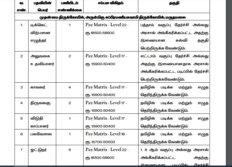 கோவை மருதமலை சுப்பிரமணியசுவாமி திருக்கோயில் மற்றும் உபகோயிலில் உள்ள வெளித்துறை மற்றும் தொழிட்நுட்ப பணியிடங்கலில் காலியாகவுள்ள பணியிடங்கள் நிரப்புவதற்கான அறிவிப்பு வெளியாகியுள்ளது.