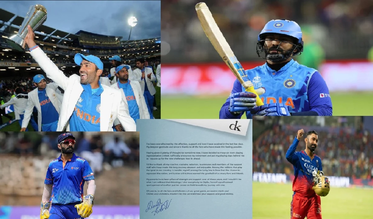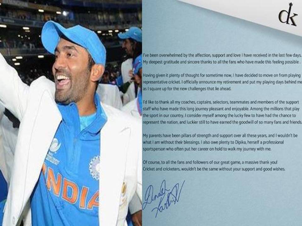 மிழகத்தைப் பூர்வீகமாக கொண்ட தினேஷ் கார்த்திக் கடந்த 2004 ஆம் ஆண்டு இந்திய அணியில் அறிமுகமானார். தனது 19வது வயதிலேயே இங்கிலாந்துக்கு எதிராக லார்ட்ஸ் மைதானத்தில் நடைபெற்ற ஒருநாள் போட்டியில் தினேஷ் கார்த்திக் சர்வதேச கிரிக்கெட்டில் அறிமுகமானார்.ஐபிஎல் கிரிக்கெட் தொடரில் டெல்லி டேர்டெவில்ஸ், பஞ்சாப் கிங்ஸ், மும்பை இந்தியன்ஸ் குஜராத் லயன்ஸ், கொல்கத்தா நைட் ரைடர்ஸ் உள்ளிட்ட அணிகளுக்காக விளையாடியுள்ளார். கடைசியாக ராயல் சேலஞ்சர்ஸ் பெங்களூரு அணிக்காக விளையாடியவர் அனைத்து வித கிரிக்கெட் போட்டியில் இருந்து விலகுவதாக அறிவித்து விட்டார்.