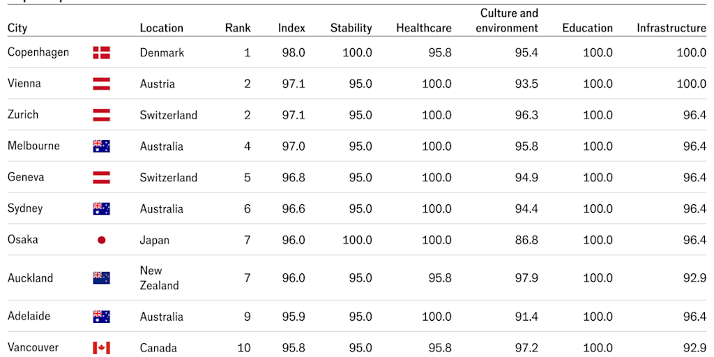 2025 ஆம் ஆண்டுக்கான பட்டியலில், கோபன்ஹேகன் (Copenhagen) முதலிடத்தைப் பிடித்துள்ளது. இது கடந்த மூன்று ஆண்டுகளாக முதலிடத்தில் இருந்த வியன்னாவை (Vienna) பின்னுக்குத் தள்ளியுள்ளது.