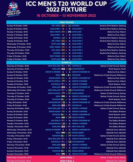 ஆஸ்திரேலியாவில் வரும் அக்டோபர் மாதம் நடக்கும் டி20 உலகக் கோப்பைப் போட்டிக்கான அட்டவணை இன்று வெளியிடப்பட்டது. இதில் சூப்பர்- 12 பிரிவில் இந்திய அணி தனது முதல் ஆட்டத்தில் பாகிஸ்தானை எதிர்கொள்கிறது.