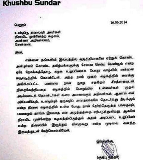 “என் அர்ப்பணிப்பும் உழைப்பும் ஒருவழிப் பாதையாகவே நீடிக்கும் என்ற நிலை கழகத்தில் உள்ளபோது, நான் தேர்ந்தெடுத்த பாதையும், பயணமும் தாங்க இயலாத மன அழுத்தத்தை ஏற்படுத்துகிறது. ஆகவே தி.மு.க.விலிருந்தும், அடிப்படை உறுப்பினர் என்ற நிலையிலிருந்தும் விலகுவது என்ற முடிவை கனத்த இதயத்துடன் மேற்கொள்கிறேன்.”