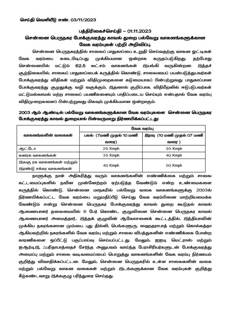 அதன்படி சென்னையில் ஆட்டோக்கள் காலை 7 மணி முதல் இரவு 10 மணி 40 கி.மீ வேகம் வரை செல்லலாம். இரு சக்கர 50 கி.மீ வேகம் வரை செல்லலாம். மேலும் இலகுரக வாகனங்கள் 60 கி.மீ வேகம் வரை செல்லலாம் என தெரிவிக்கப்பட்டுள்ளது. குடியிருப்பு பகுதிகளில் அனைத்து வாகனங்களும் 30 கி.மீ வேகம் வரை மட்டுமே செல்ல வேண்டும் என காவல்துறை தரப்பில் கூறப்பட்டுள்ளது.