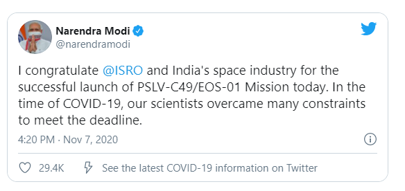 பி.எஸ்.எல்.வி. சி-49 ராக்கெட் வெற்றிகரமாக விண்ணில் ஏவப்பட்டதற்கு, இஸ்ரோவிற்கு பிரதமர் மோடி வாழ்த்து தெரிவித்து உள்ளார்.
