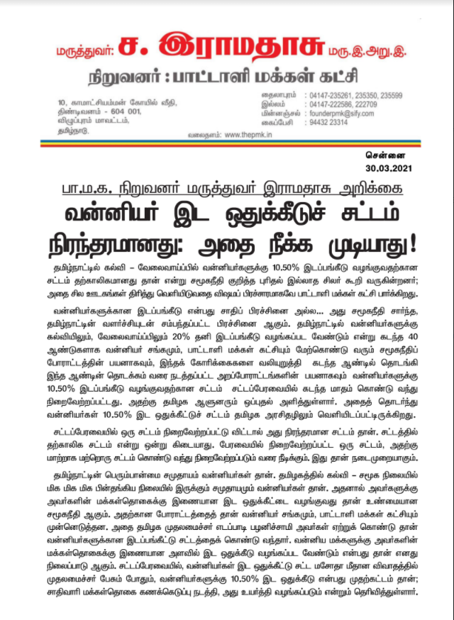 இது குறித்து, ராமதாஸ் இன்று (மார்ச் 30) வெளியிட்ட அறிக்கை இதோ: