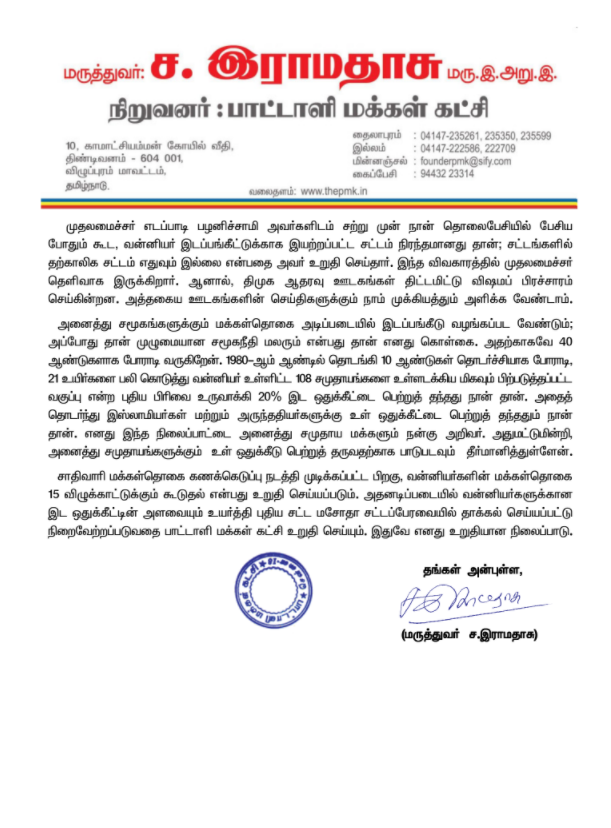 “முதல்வர் எடப்பாடி பழனிசாமியிடம் சற்று முன் நான் தொலைபேசியில் பேசிய போதும் கூட, வன்னியர் இடப்பங்கீட்டுக்காக இயற்றப்பட்ட சட்டம் நிரந்தமானது தான்; சட்டங்களில் தற்காலிக சட்டம் எதுவும் இல்லை என்பதை அவர் உறுதி செய்தார். இந்த விவகாரத்தில் முதல்வர் தெளிவாக இருக்கிறார். ஆனால், திமுக ஆதரவு ஊடகங்கள் திட்டமிட்டு விஷமப் பிரச்சாரம் செய்கின்றன. அத்தகைய ஊடகங்களின் செய்திகளுக்கும் நாம் முக்கியத்தும் அளிக்க வேண்டாம்.” என்று பாமக நிறுவனர் ராமதாஸ் தெரிவித்துள்ளார்.
