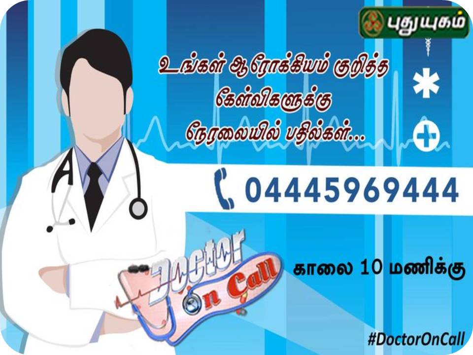 புதுயுகம் தொலைக்காட்சியில் மக்கள் மத்தியில் மிகுந்த வரவேற்பு பெற்ற “டாக்டர் ஆன் கால்” புது பொலிவுடன் பிரம்மாண்ட அரங்கில் புதிய வடிவில் திங்கள் முதல் சனி வரை காலை 10:00 மணிக்கு நேரலையாக ஒளிபரப்பாகிறது. இந்த நிகழ்ச்சியில் ஒவ்வொரு நாளும் தனித்தனி துறை சார்ந்த மருத்துவர்கள் நிகழ்ச்சியில் இடம் பெற்று நேயர்கள் கேட்கும் மருத்துவம் சார்ந்த சந்தேகங்களுக்கு பதில் அளித்து வருகின்றனர்.