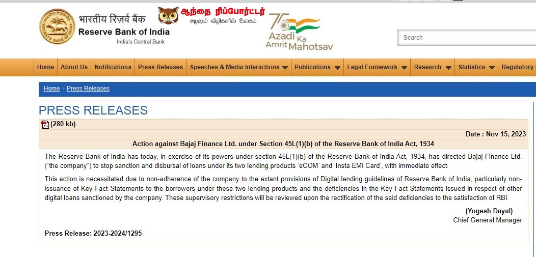 பஜாஜ் பைனான்ஸ் நிறுவனம் கடன் வழங்கத் தடை! ரிசர்வ் வங்கி அதிரடி!