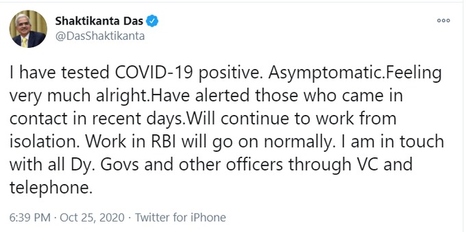 இந்திய ரிசர்வ் வங்கியின் கவர்னர் சக்திகாந்தா தாஸுக்கு கொரோனா வைரஸ் தொற்று உறுதி செய்யப்பட்டுள்ளது