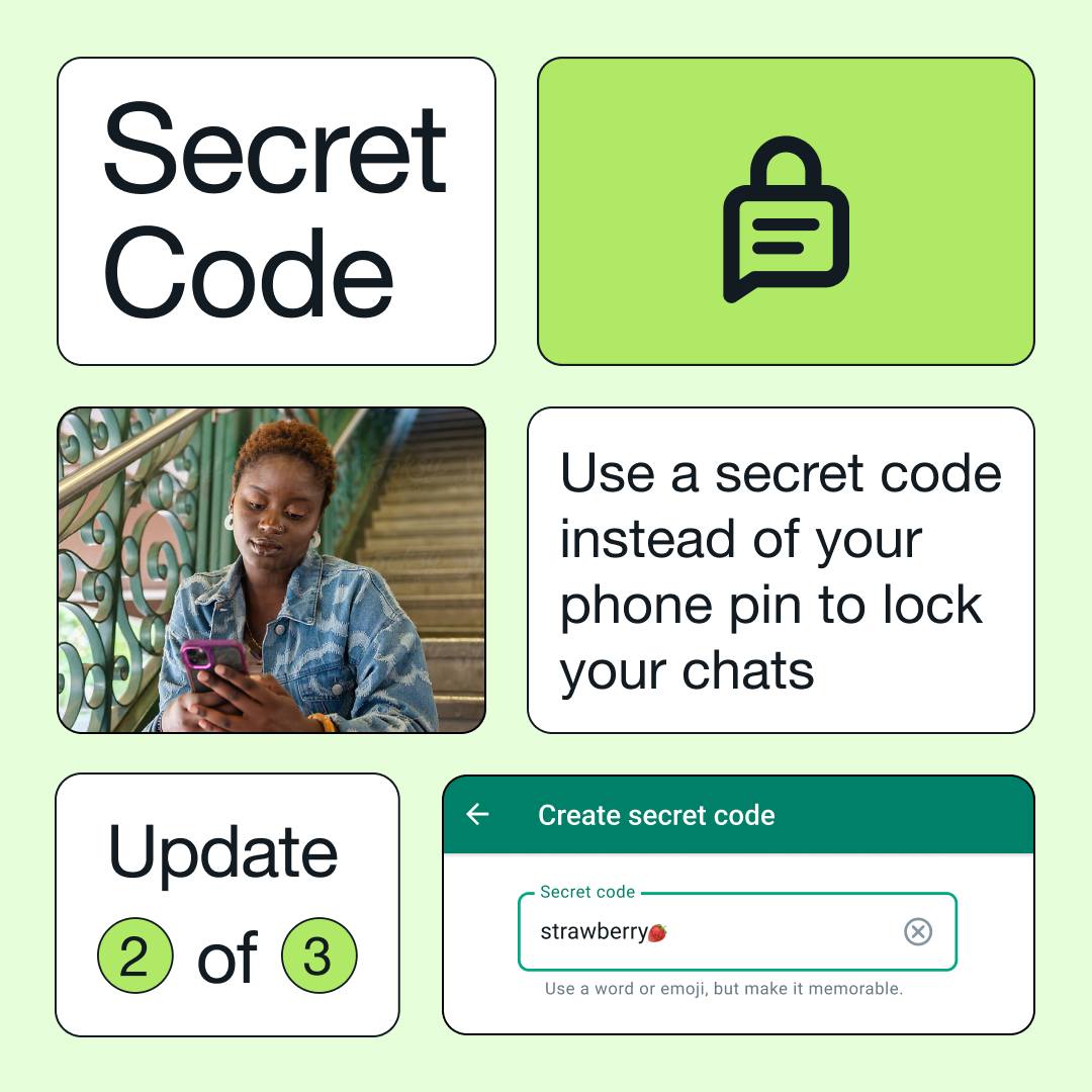வாட்ஸ்அப் சேட்டுகளின் பிரைவசியை பாதுகாக்க சேட்டுகளை லாக் செய்யும் சீக்ரெட் கோட் முறை அறிமுகம் செய்யப்பட்டிருக்கிறது. குறிப்பிட்ட சேட்களை பாஸ்வோர்ட் அமைத்து பாதுகாத்துக் கொள்ள முடியும். இதற்கு பாஸ்வேர்டுகளாக எண்களையோ அல்லது எமோஜிக்களையோ பயன்படுத்த முடியும்.இதன் மூலம் குறிப்பிட்ட சாட்டிங் ஒன்றை பிரத்யேகமாய் பூட்டுப் போடலாம். தனிப்பட்ட ரகசியக் குறியீடுகளை உள்ளிடுவதன் மூலம் நாம் மட்டுமே அந்த சாட்டிங்கை மீண்டும் அணுகலாம். இதை அடுத்து சீக்ரெட் கோட் மூலம் லாக் செய்யப்பட்ட அல்லது மற்றவர் பார்வையில் மறைக்கப்பட்ட அரட்டைகளை நாம் மட்டுமே எளிதில் அணுக முடியும். இதற்கு மொபைலின் லாக் குறியீடு/பாஸ்வேர்ட் அல்லாத, தனி ரகசியக் குறியீட்டினை அமைத்துக் கொள்ளலாம். மனைவி கையில் தனது அலைபேசி தவழும்போது கூட, கவலையின்றி கணவரால் இனி புன்னகைக்க முடியும்.