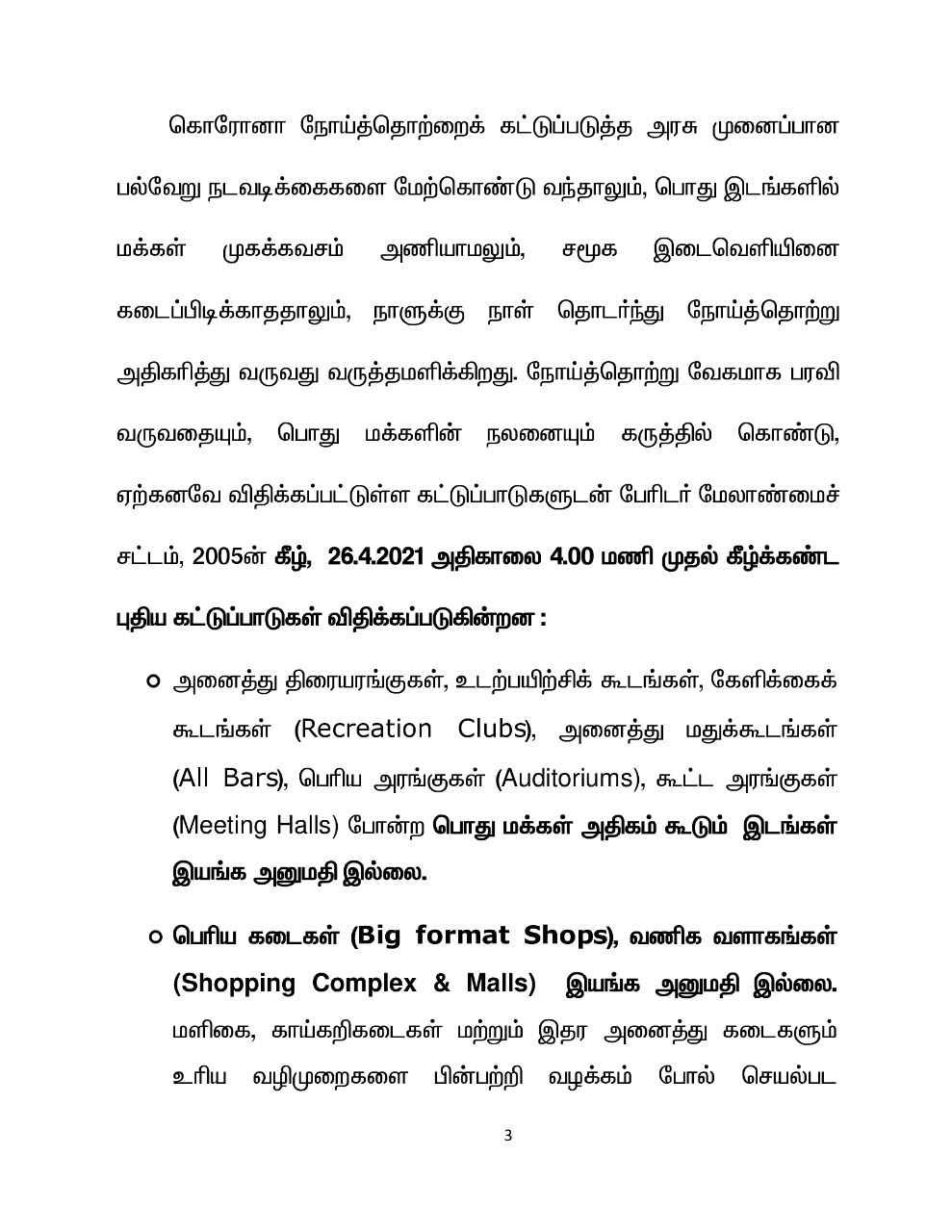 கொரோனா நோய்த்தொற்றைக் கட்டுப்படுத்த அரசு முனைப்பான பல்வேறு நடவடிக்கைகளை மேற்கொண்டு வந்தாலும், பொது இடங்களில் மக்கள் முகக்கவசம் அணியாமலும், சமூக இடைவெளியினை கடைப்பிடிக்காததாலும், நாளுக்கு நாள் தொடர்ந்து நோய்த்தொற்று அதிகரித்து வருவது வருத்தமளிக்கிறது. நோய்த்தொற்று வேகமாக பரவி வருவதையும், பொது மக்களின் நலனையும் கருத்தில் கொண்டு, ஏற்கனவே விதிக்கப்பட்டுள்ள கட்டுப்பாடுகளுடன் பேரிடர் மேலாண்மைச் சட்டம், 2005ன் கீழ், 26.4.2021 அதிகாலை 4.00 மணி முதல் கீழ்க்கண்ட புதிய கட்டுப்பாடுகள் விதிக்கப்படுகின்றன :