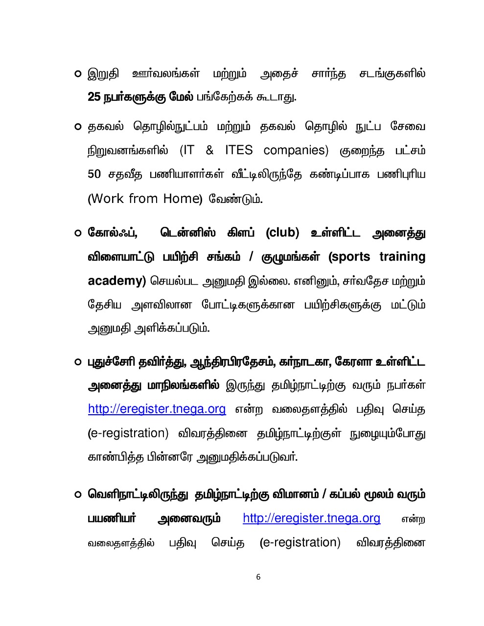 13. வெளிநாட்டிலிருந்து தமிழ்நாட்டிற்கு விமானம் / கப்பல் மூலம் வரும் பயணியர் அனைவரும் http://eregister.tnega.org என்ற வலைதளத்தில் பதிவு செய்த விவரத்தினை தமிழ்நாட்டிற்குள் நுழையும்போது காண்பித்த பின்னரே அனுமதிக்கப்படுவர்.