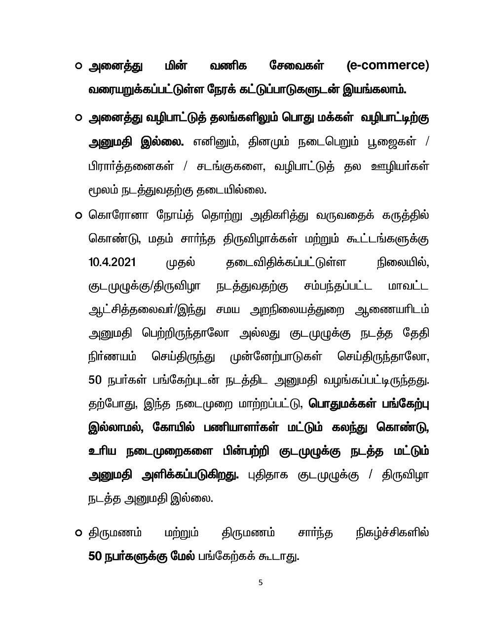 7. கொரோனா நோய்த் தொற்று அதிகரித்து வருவதைக் கருத்தில் கொண்டு, மதம் சார்ந்த திருவிழாக்கள் மற்றும் கூட்டங்களுக்கு 10.4.2021 முதல் தடைவிதிக்கப்பட்டுள்ள நிலையில், குடமுழுக்கு/திருவிழா நடத்துவதற்கு சம்பந்தப்பட்ட மாவட்ட ஆட்சித்தலைவர்/இந்து சமய அறநிலையத்துறை ஆணையரிடம் அனுமதி பெற்றிருந்தாலோ அல்லது குடமுழுக்கு நடத்த தேதி நிர்ணயம் செய்திருந்து முன்னேற்பாடுகள் செய்திருந்தாலோ, 50 நபர்கள் பங்கேற்புடன் நடத்திட அனுமதி வழங்கப்பட்டிருந்தது. தற்போது, இந்த நடைமுறை மாற்றப்பட்டு, பொதுமக்கள் பங்கேற்பு இல்லாமல், கோயில் பணியாளர்கள் மட்டும் கலந்து கொண்டு, உரிய நடைமுறைகளை பின்பற்றி குடமுழுக்கு நடத்த மட்டும் அனுமதி அளிக்கப்படுகிறது. புதிதாக குடமுழுக்கு / திருவிழா நடத்த அனுமதி இல்லை.