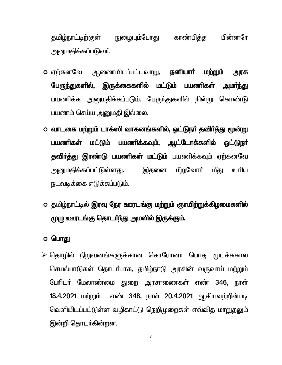 15. வாடகை மற்றும் டாக்ஸி வாகனங்களில், ஓட்டுநர் தவிர்த்து மூன்று பயணிகள் மட்டும் பயணிக்கவும், ஆட்டோக்களில் ஓட்டுநர் தவிர்த்து இரண்டு பயணிகள் மட்டும் பயணிக்கவும் ஏற்கனவே அனுமதிக்கப்பட்டுள்ளது. இதனை மீறுவோர் மீது உரிய நடவடிக்கை எடுக்கப்படும்.