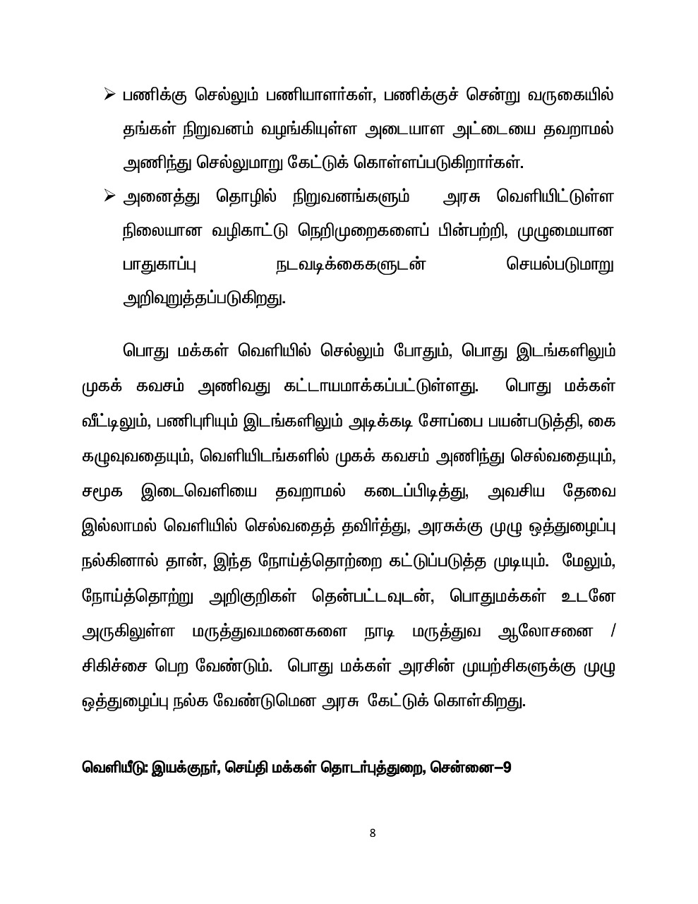 19. பொது மக்கள் வெளியில் செல்லும் போதும், பொது இடங்களிலும் முகக் கவசம் அணிவது கட்டாயமாக்கப்பட்டுள்ளது. பொது மக்கள் வீட்டிலும், பணிபுரியும் இடங்களிலும் அடிக்கடி சோப்பை பயன்படுத்தி, கை கழுவுவதையும், வெளியிடங்களில் முகக் கவசம் அணிந்து செல்வதையும், சமூக இடைவெளியை தவறாமல் கடைப்பிடித்து, அவசிய தேவை இல்லாமல் வெளியில் செல்வதைத் தவிர்த்து, அரசுக்கு முழு ஒத்துழைப்பு நல்கினால் தான், இந்த நோய்த்தொற்றை கட்டுப்படுத்த முடியும். மேலும், நோய்த்தொற்று அறிகுறிகள் தென்பட்டவுடன், பொதுமக்கள் உடனே அருகிலுள்ள மருத்துவமனைகளை நாடி மருத்துவ ஆலோசனை / சிகிச்சை பெற வேண்டும்.