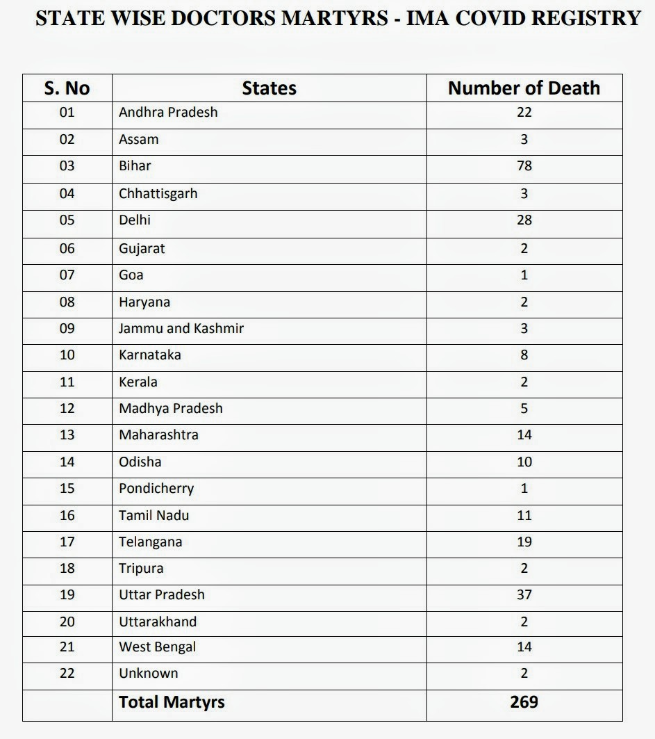 இதுவரை 1000திற்கும் மேற்பட்ட டாக்டர்கள் இறந்துவிட்டதாக இந்திய மருத்துவர்கள் சங்கம் கூறினாலும், உண்மையான எண்ணிக்கை மிக அதிகமாக இருக்கலாம். இந்திய மருத்துவ சங்கத்தில் கிட்டத்தட்ட 3.5 லட்சம் உறுப்பினர்கள் மட்டுமேபதிவு செய்து உள்ளனர். இருப்பினும், இந்தியாவில் 12 லட்சத்துக்கும் மேற்பட்ட மருத்துவர்கள் உள்ளனர்.