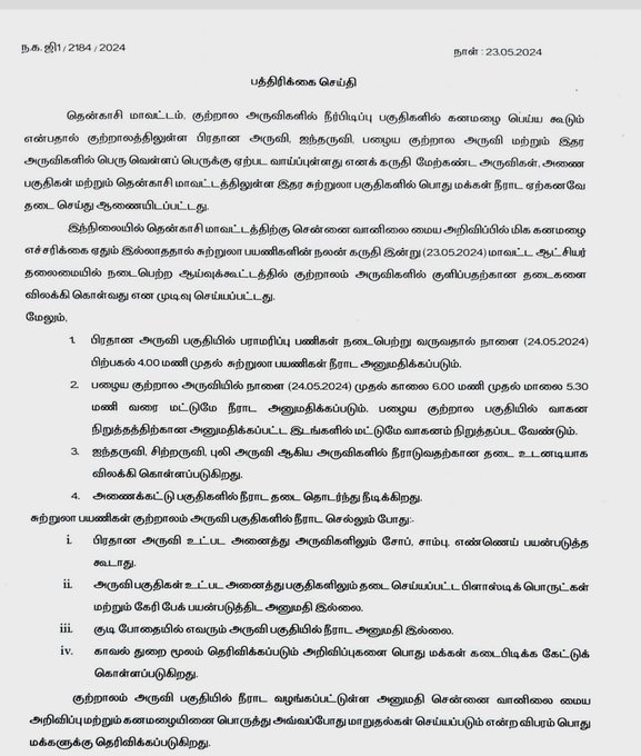 குற்றால அருவிகளில் குளிப்பதற்கு நேரக் கட்டுப்பாடுகள்!- கலெக்டர் தகவல்!