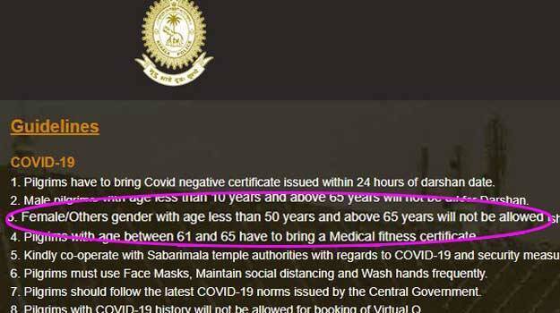 அது மட்டுமின்றி பக்தர்கள் கூட்டமாக கூடுவதை தவிர்க்கசனி மற்றும் ஞாயிறு தினங்களில் 3 ஆயிரம் பேரும், மற்ற நாட்களில் 3000 ஆயிரம் பேரும் அனுமதிக்கப்பட்டு வருகின்றனர். இந்நிலையில் சபரிமலை ஐயப்பன் கோயிலில் பெண்கள் வழிபாடு செய்வதற்கு வயது வரம்பை கேரள அரசு நிர்ணயம் செய்துள்ளது. சபரிமலை ஐயப்ப பக்தர்களின் சேவைகளுக்காக கேரள காவல்துறையுடன் இணைந்து திருவிதாங்கூர் தேவசம்போர்டு புதிய வலைதளத்தை தொடங்கியுள்ளது. அதில் சபரிமலைக்கு வரக் கூடிய பெண்களுக்கான வயதுவரம்பு குறிப்பிடப்பட்டு உள்ளது.